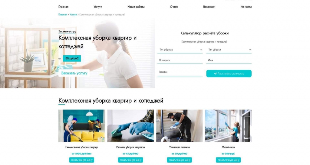 Задача: Разработка и создание сайта для клининговой компании в Твери. Создать каталог всевозможных услуг по клинингу. Создать форму для расчета стоимости уборки. Сделать адаптивный и быстро загружаемый сайт.