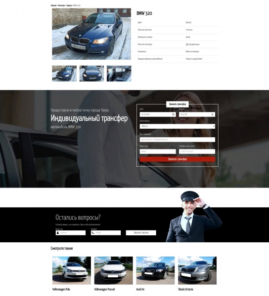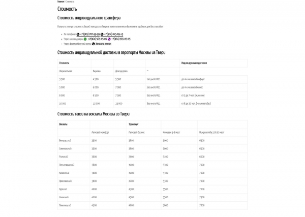 Задача: Разработка и создание сайта для компании занимающая индивидуальным трансфером по всей России из Твери. Создание страниц с подробным описанием трансфера в аэропорт Москвы, на жд вокзал Москвы и перевозка по всем России. Создание каталога с автопарком. Создание дополнительных страниц со стоимостью и контактами. Создание форм для обратной связи. Сделать адаптивный и быстро загружаемый сайт.