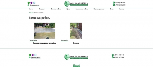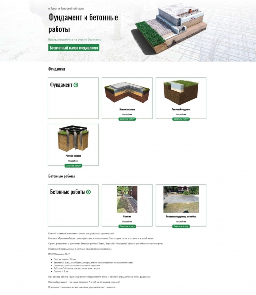 Задача: Разработка и создание сайта для компании по изготовлению фундамента в Твери. Создание страниц с подробным описанием каждого типа фундамента. Создание страниц с дополнительными услугами. Создание страниц с выполненными работами. Создание форм для обратной связи. Сделать адаптивный и быстро загружаемый сайт.