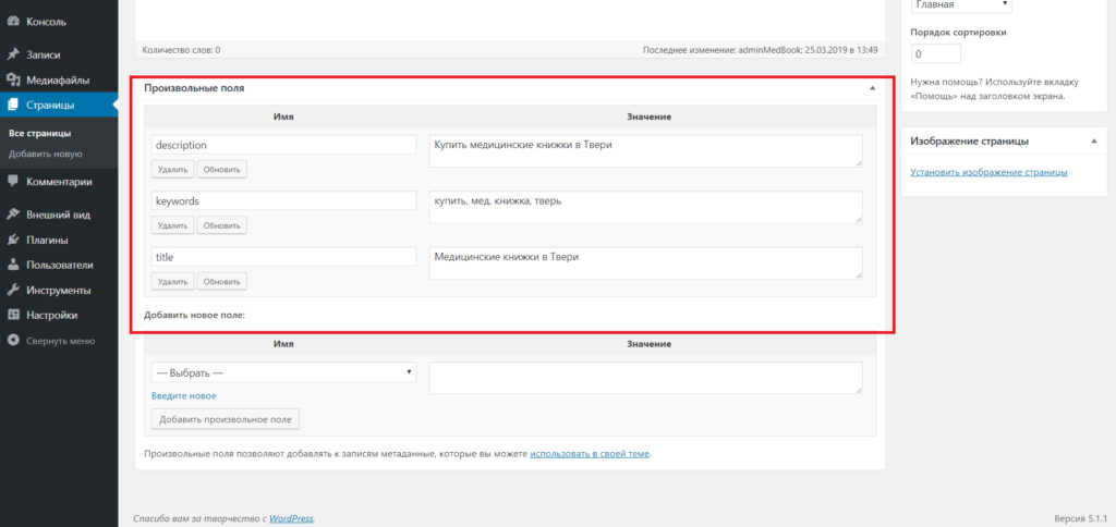 Ниже выпадающий список для выбора SEO тегов – title, description, keywords. Выбираем интересующий нас тег и заполняем поле Значение (справа). После заполнения, нажимаем кнопку Добавить произвольное поле. Можно заполнить все или остановиться на одном.