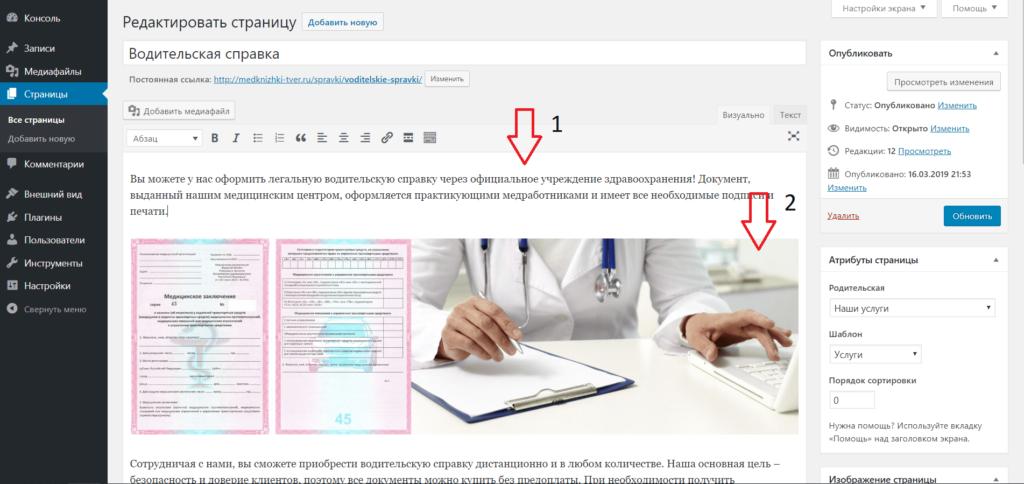 5. Заходим Страницы (шаг 2) и выбираем страницу, например, Водительская справка. Открылась страница для редактирования страницы Водительская справка на сайте.