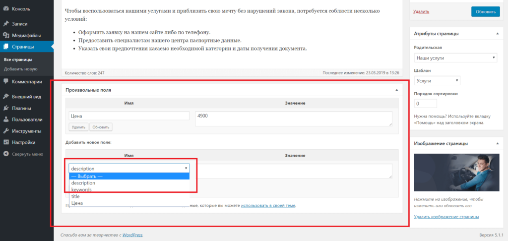 В блоке Произвольные поля добавлено поле Цена. При редактировании поля, будут везде изменены цены на услугу Водительская справка.